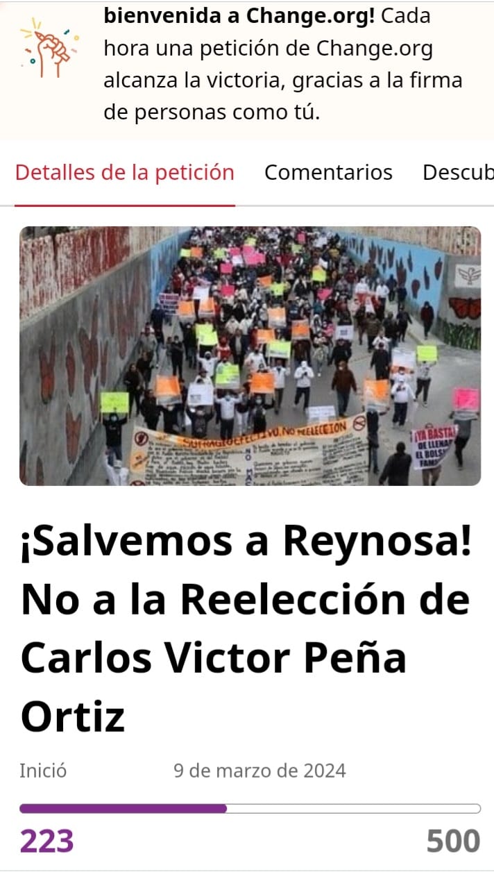 Reynosa, Tamaulipas.- Ciudadanos inconformes por la designación de Carlos Peña Ortiz como candidato de Morena, a la alcaldía de Reynosa, iniciaron el levantamiento de firmas a través de la organización mundial change.org, para evitar que siga tres años más gobernando dicha ciudad fronteriza.