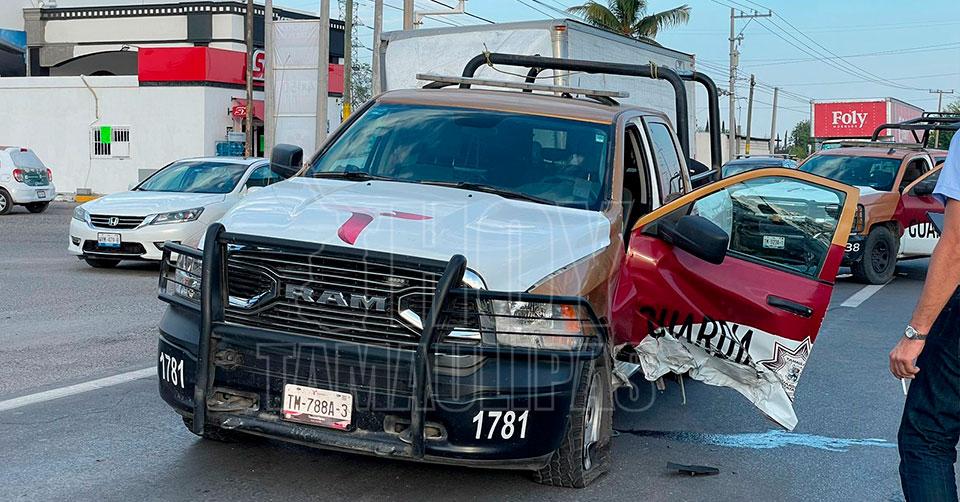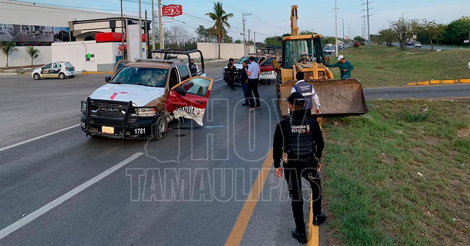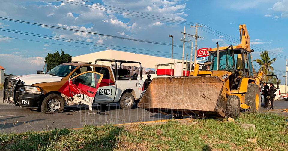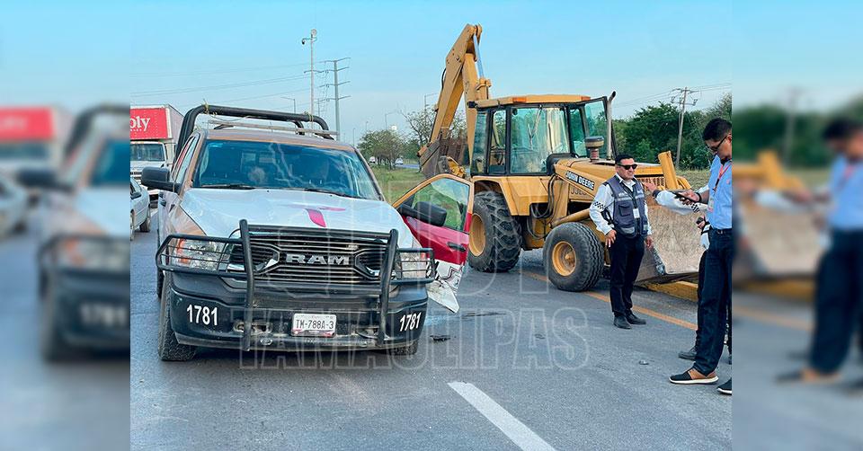 Ciudad Victoria, Tamaulipas. - La falta de precaución por parte del operador de una retroexcavadora fue la causa para que se impactara contra la parte lateral de una patrulla de la Guardia Estatal, destrozando la puerta del conductor.