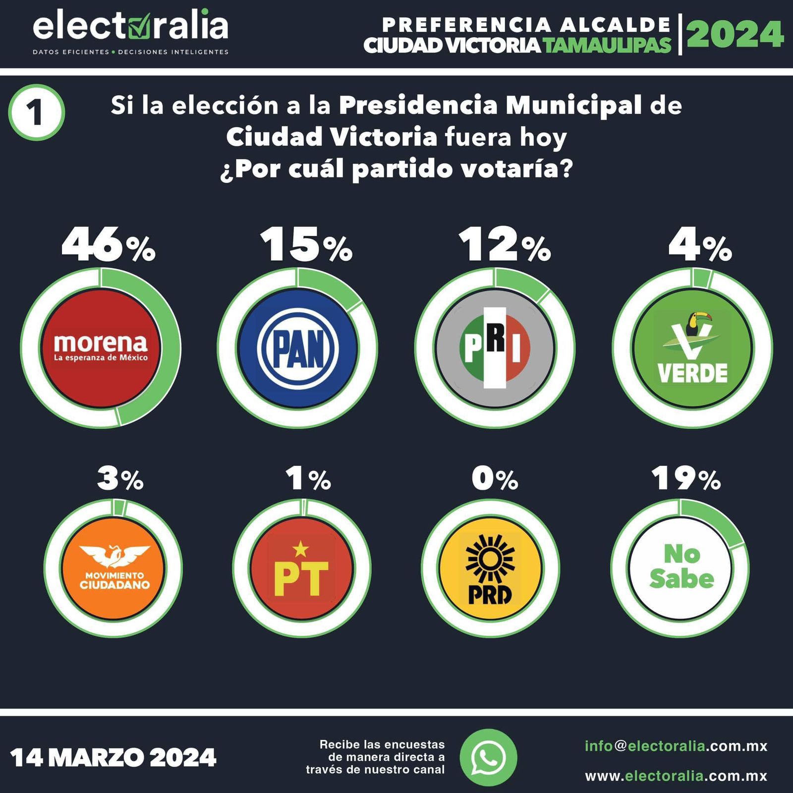 De acuerdo con lo indicado por la agencia electoralia en su más reciente encuesta, el partido guinda arrasaría en Victoria en contra del PAN y de Movimiento Ciudadano, que estarían muy distantes del triunfo el próximo dos de junio.