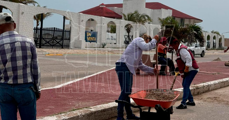 A lo largo del paseo turístico, se observan las cuadrillas retirando la arena que se asienta en las orillas de la calle.