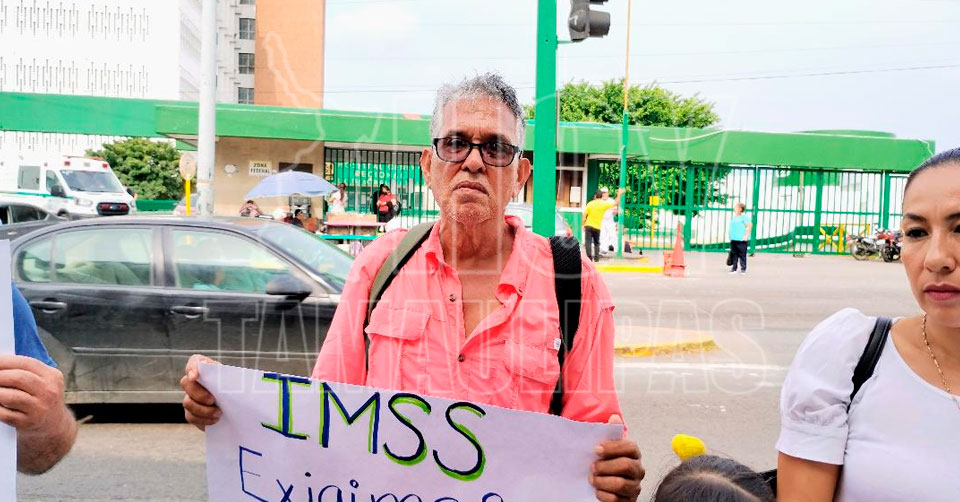 Se trata del jubilado del Gremio Unido de Alijadores, Fortino Cervantes Santos, quien acompañado de otros derechohabientes llegó hasta la sede del Hospital Regional número 6 del IMSS de Ciudad Madero para encabezar la manifestación, pues con cada día que pasa él ve cómo se deteriora su condición física.