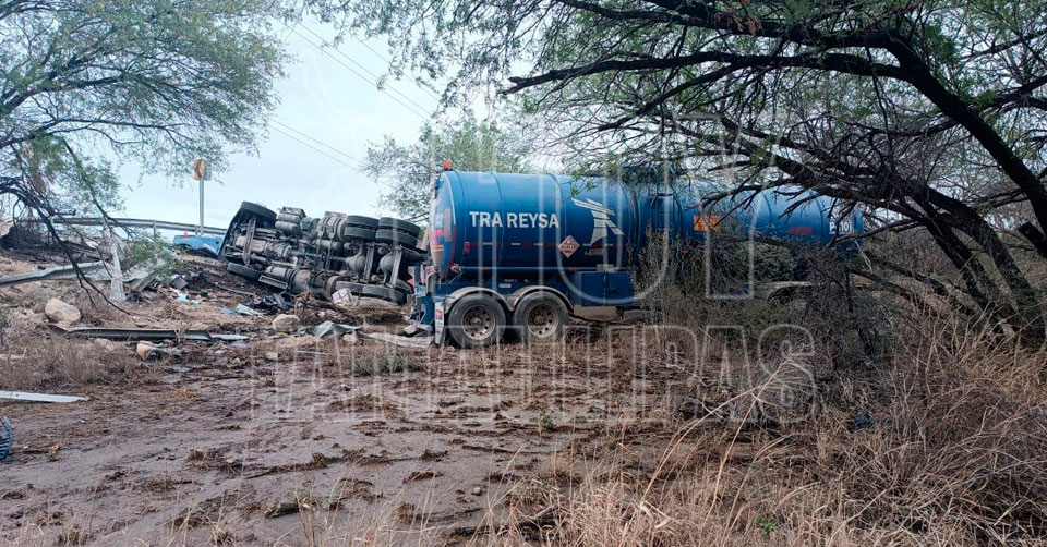 Llera, Tamaulipas. - Una pipa que transportaba diésel se impactó contra la barra de contención y se volcó al circular sobre el kilómetro 01 de la Carretera Federal 83, a la altura del municipio de Llera.