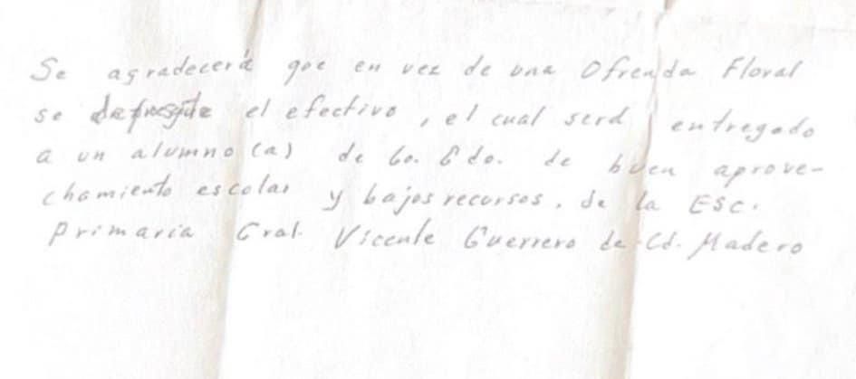 “Se agradecerá que en vez de una ofrenda floral se entregue el efectivo, el cual será entregado a un alumno o alumna de 6to grado de buen aprovechamiento escolar y bajos recursos de la escuela primaria general Vicente Guerrero en Ciudad Madero”.