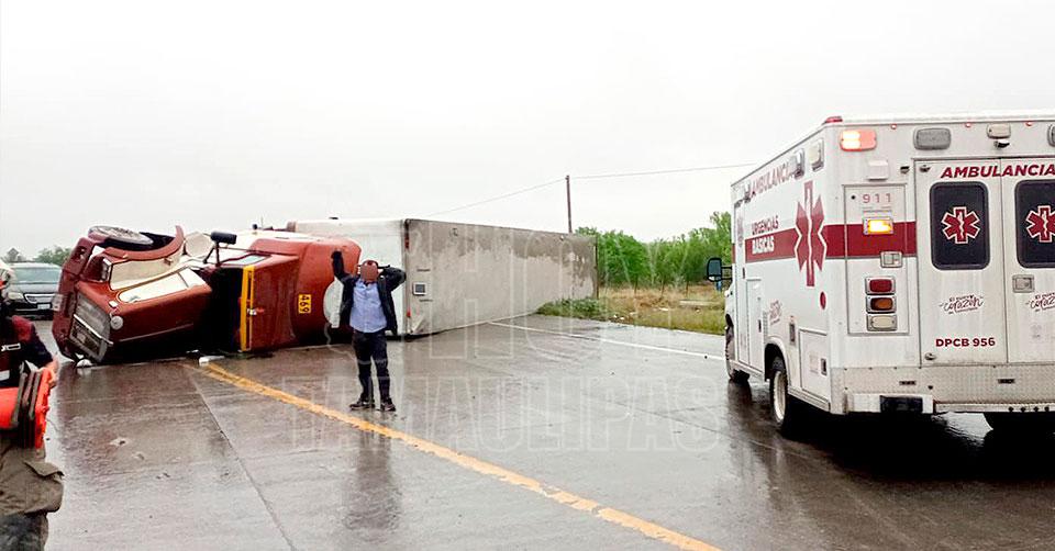 Nuevo Laredo, Tamaulipas. - Un tractocamión cargado con zinc volcó este miércoles por la tarde en el Libramiento Mex 2 de Nuevo Laredo, resultando su operador vivo de milagro.