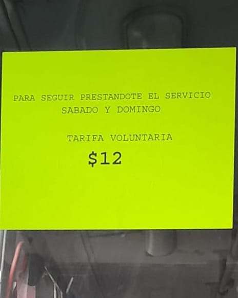 Señalaron que los choferes de las unidades de dicha ruta, desde el fin de semana pasado han colocado anuncios informándoles que para prestar el servicio del transporte público durante los días sábados y domingos, tendrán la tarifa “voluntaria” de 12 pesos.