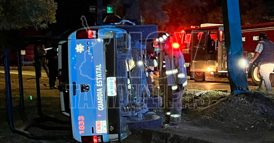 Choca y vuelca patrulla de la Guardia Estatal en Victoria; 2 lesionados