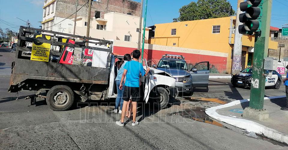 Tampico, Tamaulipas. - Dos personas heridas y cuantiosos daños materiales fue el saldo que dejó el fuerte choque entre una camioneta propiedad de la Dirección de Servicios Públicos del Ayuntamiento de Tampico y otra unidad en la que viajaban turistas procedentes de Nuevo León.