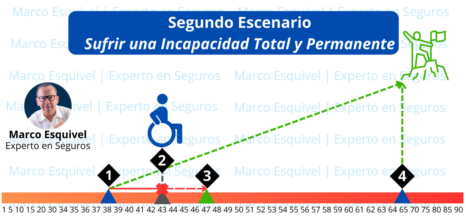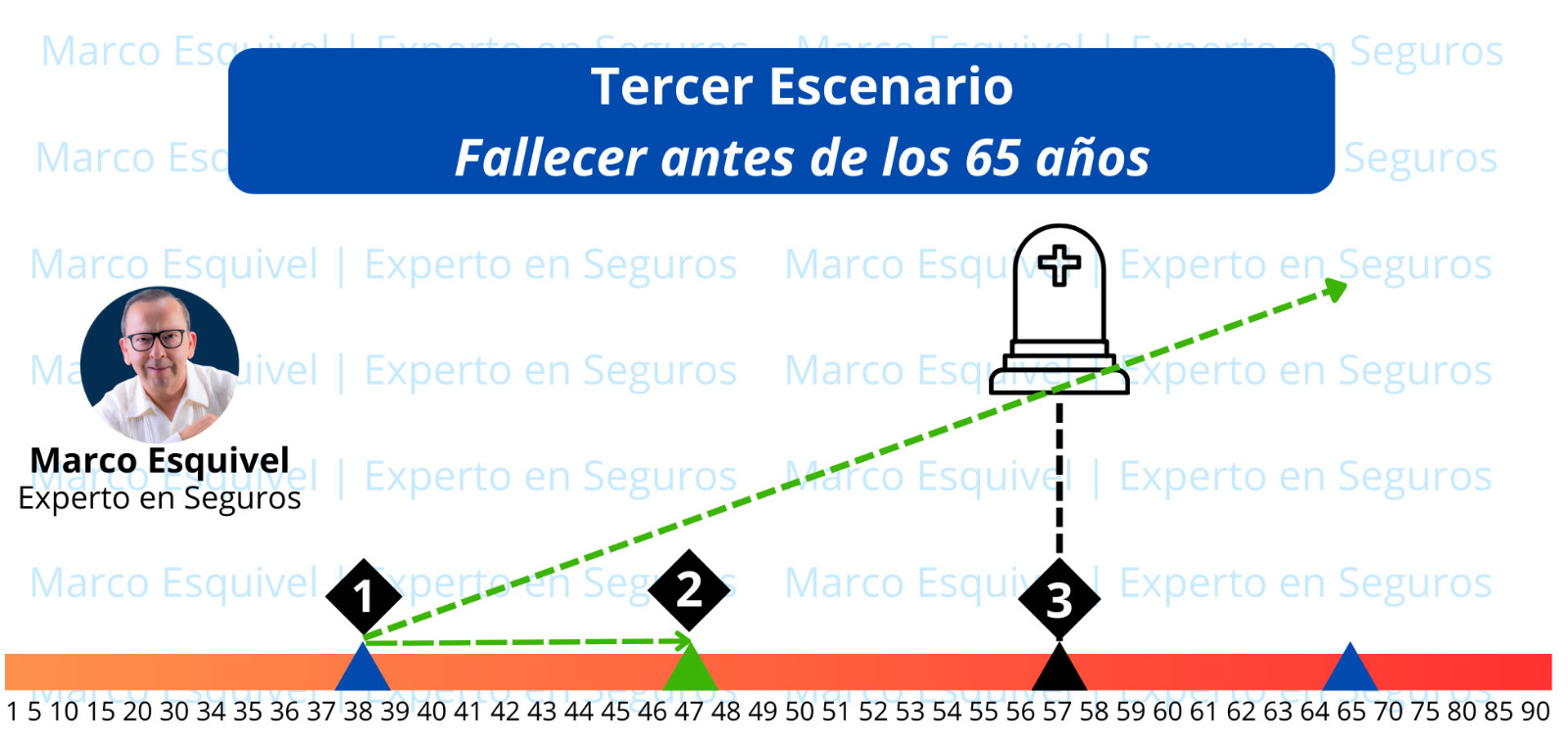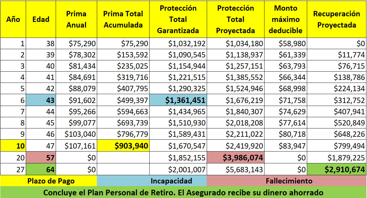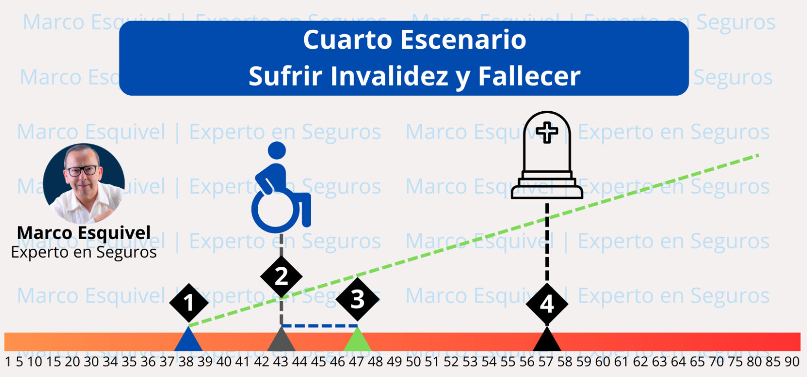 Como ya se explicó a los 43 años, recibe el dinero por la Invalidez Total y Permanente; se activa la Exención de Pago de Primas y queda protegido por todo lo que resta del Plan, sin tener que pagar hasta los 47 como estaba originalmente (3). Lamentablemente él falleció a los 57 años (4) y entonces su beneficiario recibe el dinero por el Seguro de Vida y lo que tenía en su Fondo de Aportaciones.