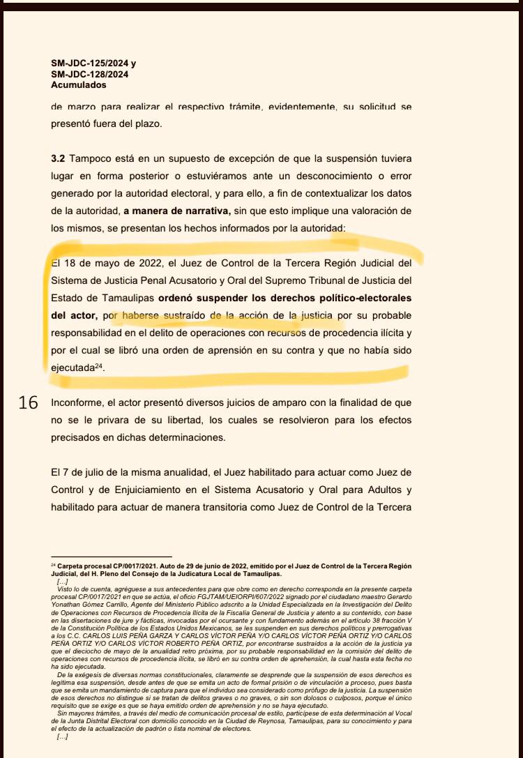 “Por tanto, queda subsistente el auto de fecha veintinueve de junio de dos mil veintidós, en el cual se ordenó la suspensión de los derechos políticos y prerrogativas prevista en el numeral 38 de la Constitución Política de los Estados Unidos Mexicanos, así como el oficio 684/2022, dirigido al C. Vocal de la Junta Ejecutiva Distrital de Reynosa Tamaulipas”, señala la sentencia de la Sala Regional del Poder Judicial de Tamaulipas, al considerar que Carlos Peña Ortiz evade la acción de la justicia “por el ilícito de DELITO DE OPERACIONES CON RECURSOS DE PROCEDENCIA ILÍCITA, en agravio de LA SOCIEDAD”.