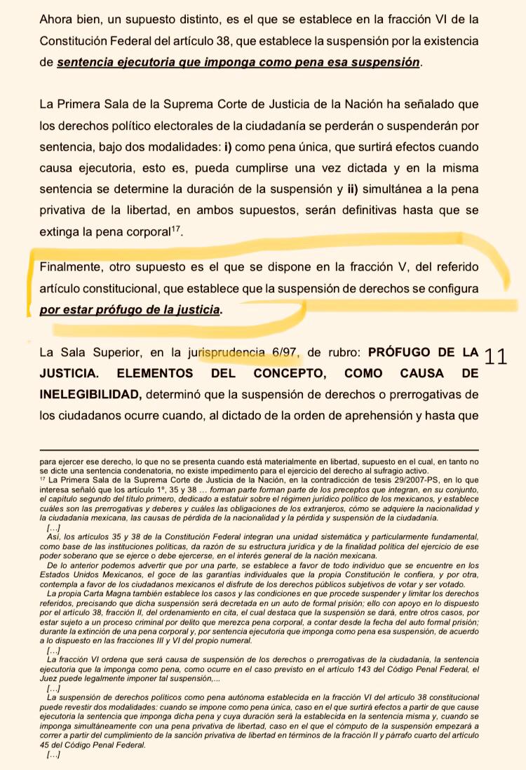De acuerdo a la fracción V del artículo 38 constitucional, los derechos políticos se suspenden cuando una persona se encuentra “prófugo de la justicia, desde que se dicte la orden de aprehensión hasta que prescriba la acción pena”.