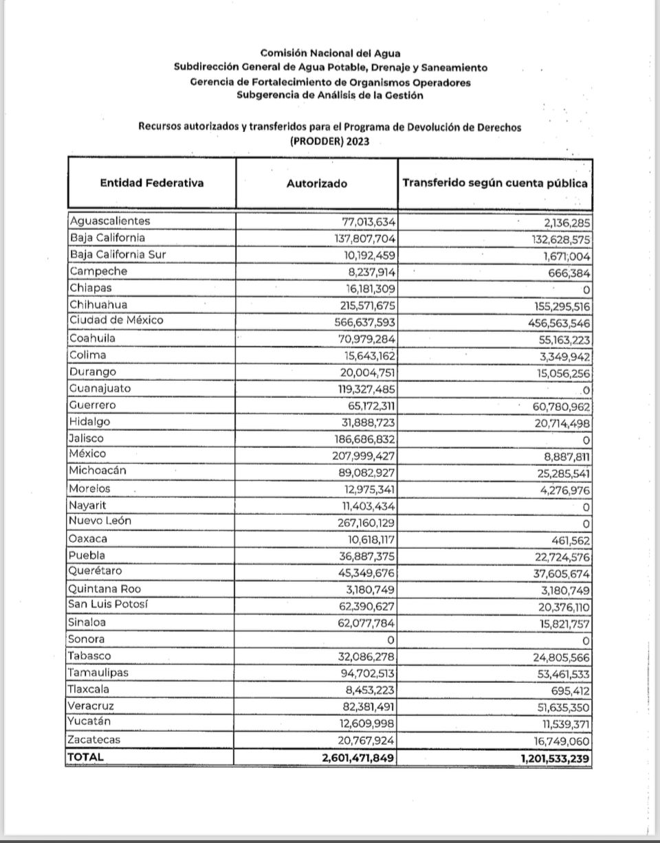 Según se lee en el informe sobre recursos autorizados durante el cuarto trimestre al PRODDER en 2023, fechado el pasado 7 de marzo y enviado por la Subdirección General de Agua Potable, Drenaje y Saneamiento de Conagua a la Cámara de Senadores, revela que los estados con más dinero transferido fueron Ciudad de México, Chihuahua, Baja California, Guerrero, Coahuila, Tamaulipas, Veracruz, Querétaro, Michoacán y Tabasco, respectivamente.