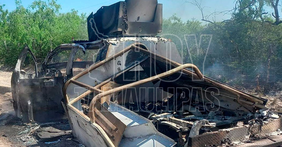 Reynosa, Tamaulipas. - Una patrulla blindada y artillada de la Guardia Estatal quedó convertida en chatarra tras incendiarse presuntamente a causa de un corto circuito.