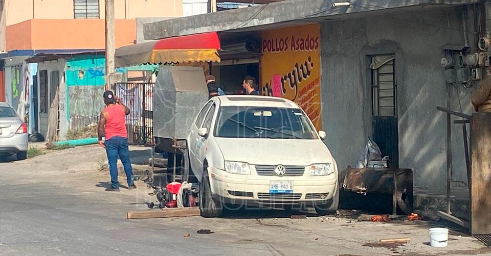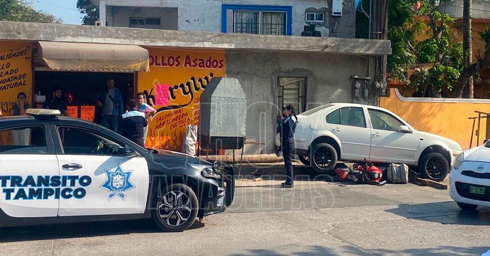 Tampico, Tamaulipas. - El conductor de un Jetta, quien además de derribar un poste, embistió con todo y asador a un joven que preparaba pollo asado en la banqueta a las afueras de un negocio, terminando la unidad motriz sobre una motocicleta que se encontraba estacionada, ya que su conductor iba a recoger un pedido.