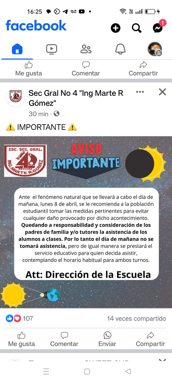 A través de sus redes sociales, los directivos, por ejemplo, de la Secundaria Federal número 4, señalaron que, ante el fenómeno astronómico de este lunes, recomiendan a la población estudiantil tomar las medidas pertinentes para evitar cualquier daño provocado por dicho acontecimiento.
