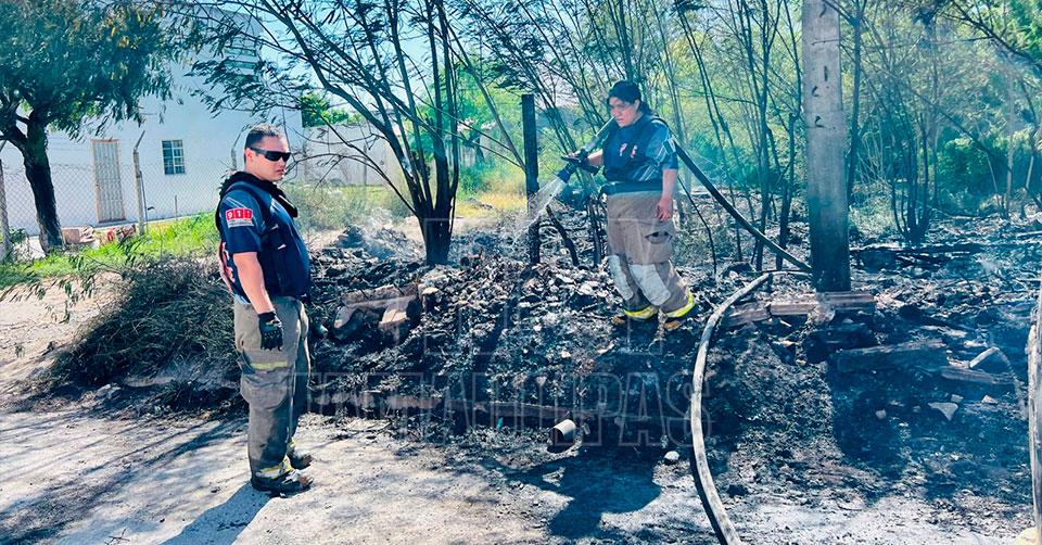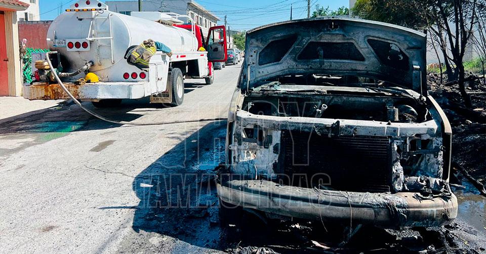 Elementos del Cuerpo de Bomberos a bordo de una pipa sofocaron las llamas que se estaban propagando hasta consumir en su totalidad la camioneta y el predio.