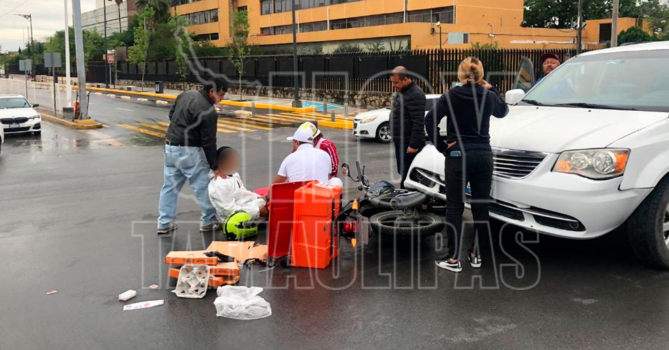 Reynosa, Tamaulipas. – Un joven motociclista repartidor de una empresa de pizzas resultó con probable fractura en una pierna, tras estrellarse contra una camioneta Town Country blanca en el Bulevar José María Morelos con Lázaro Cárdenas.