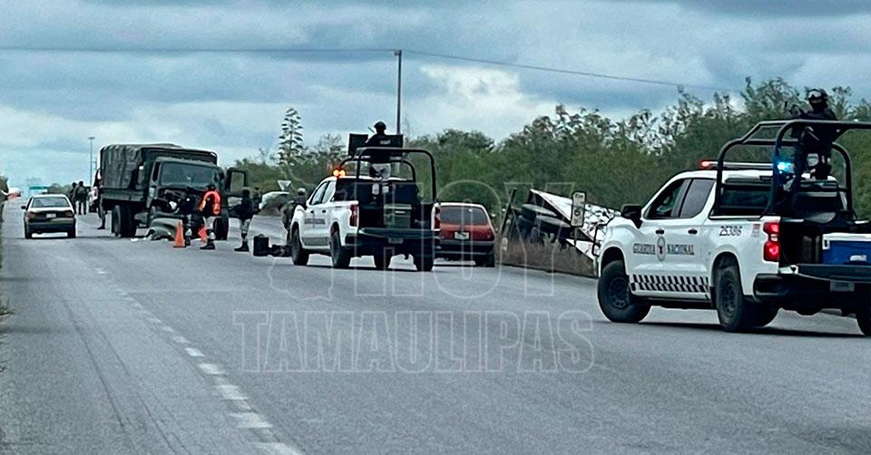 Ciudad Victoria, Tamaulipas. – Un choque entre una unidad de transporte de personal militar y una unidad de carga pesada dejó como saldo preliminar cuantiosos daños y el cierre parcial del Libramiento Ciudad Victoria a la altura del Ejido Santa Clara.