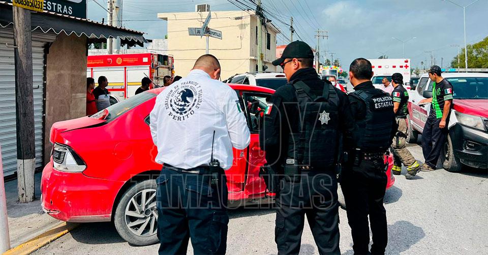 Matamoros, Tamaulipas. - Un fuerte accidente se suscitó en el cruce de Sendero Nacional y José López Portillo de la colonia Cedritos, cuando los ebrios tripulantes de un Volkswagen, Jetta, rojo, dieron vuelta en “U” y se atravesaron al paso de una Dodge, Caravan, blanca, provocando ser impactados en el costado del copiloto.