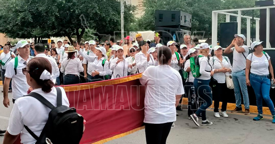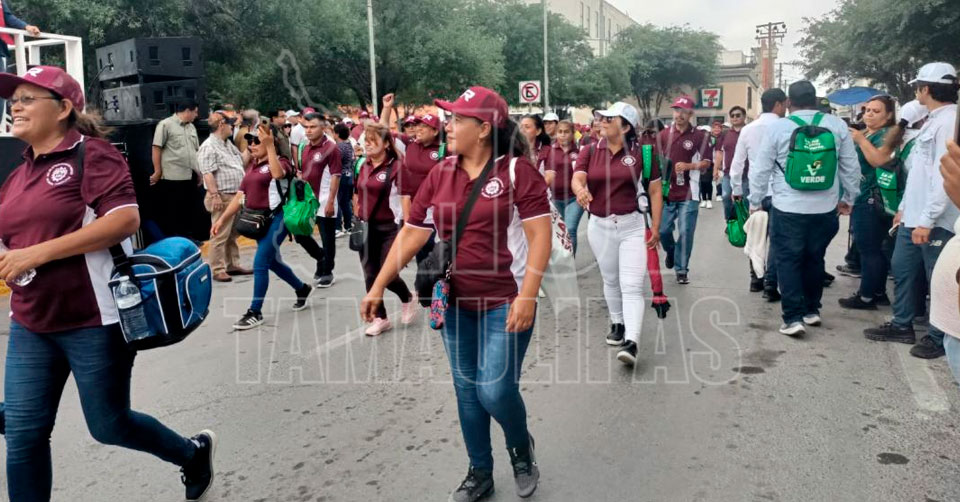 El contingente fue encabezado por el líder de la Federación de Trabajadores de Reynosa (FTR) Reynaldo Garza Elizondo, acompañado de los candidatos al Senado por el Verde, Eugenio Hernández Flores y Maki Ortiz, así como el candidato a la reelección Carlos Peña Ortiz.