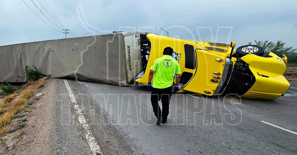 Trailero salva la vida tras volcadura en Nuevo Laredo