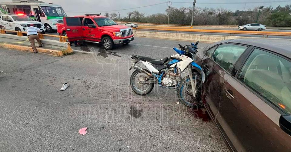 Altamira, Tamaulipas. - Con graves lesiones terminó un infortunado motociclista, al estrellarse a considerable velocidad en el costado de un automóvil, que según los primeros indicios se le atravesó de manera repentina