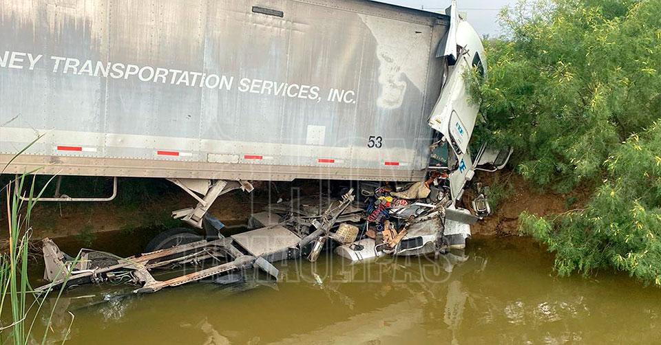 Nuevo Laredo, Tamaulipas. — El operador de un tráiler murió aplastado dentro de la cabina de su vehículo de carga, luego de que se salió del camino en la autopista a Nuevo Laredo y cayó en un brazo de un cuerpo de agua, este domingo por la mañana.