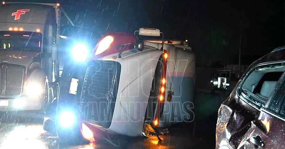 Trailero choca contra camellón en Nuevo Laredo durante tormenta