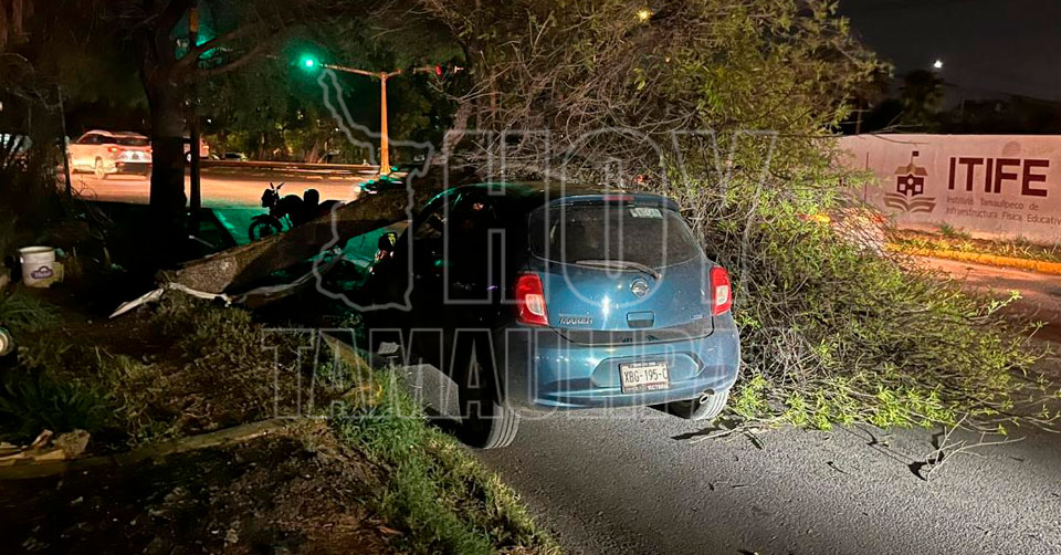 Árbol cayó sobe auto de plataforma en Ciudad Victoria