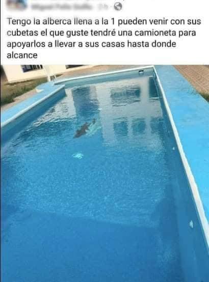 “Jálense, tengo la alberca llena, 78 mil litros de agua que puedo compartir. Pueden venir con sus cubetas a la 1, el que guste. Tendré una camioneta para apoyarlos a llevar a sus casas hasta donde alcance”, se lee en la publicación.