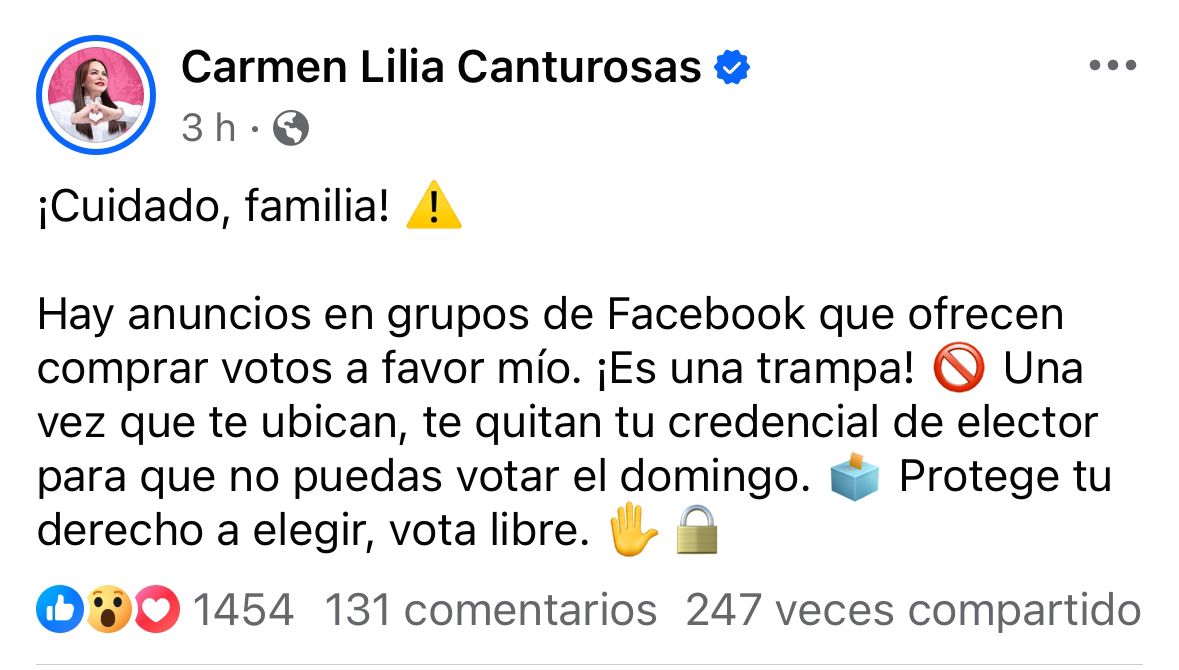“Cuidado familia, existen anuncios en grupos de Facebook que ofrecen comprar votos a favor mío ¡Es una trampa!. Una vez que te ubican te quitan tu credencial de elector para que no puedas votar el domingo” publicó la candidata.