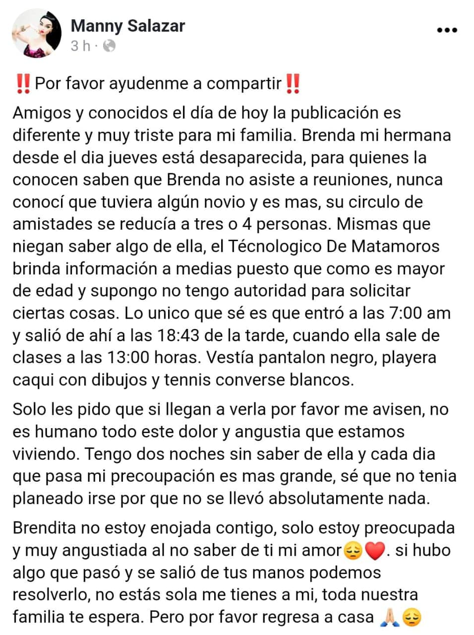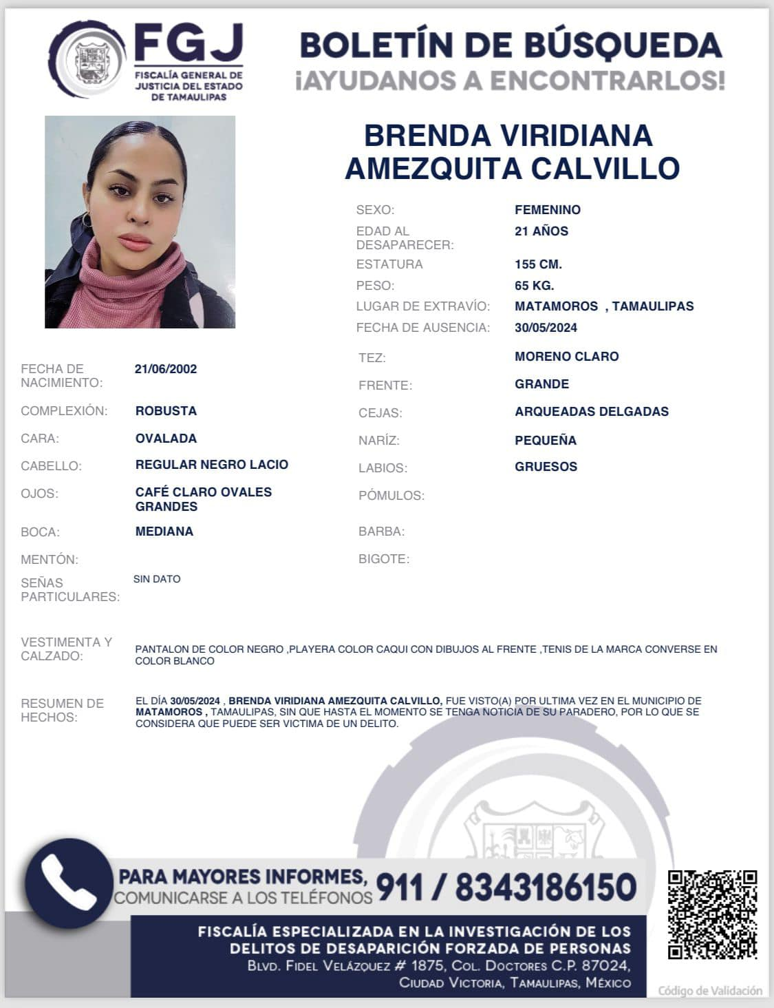 Matamoros, Tamaulipas. - Desde el pasado jueves 30 de mayo que no se sabe nada de Brenda Viridiana Amezquita Calvillo, de 21 años de edad, quien desapareció en Matamoros; Su familia está desesperada por encontrarla.