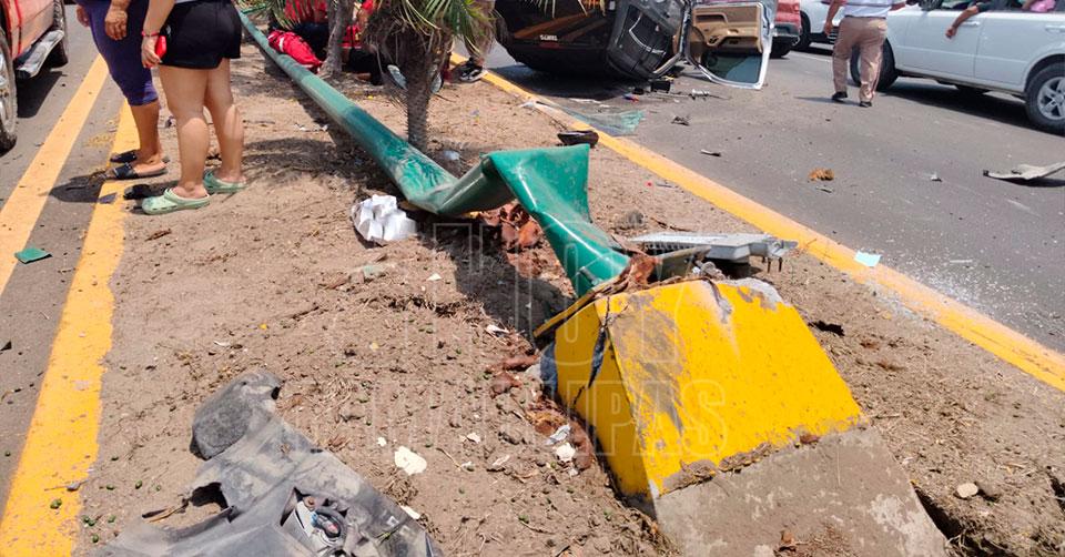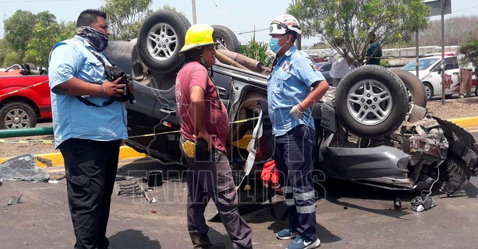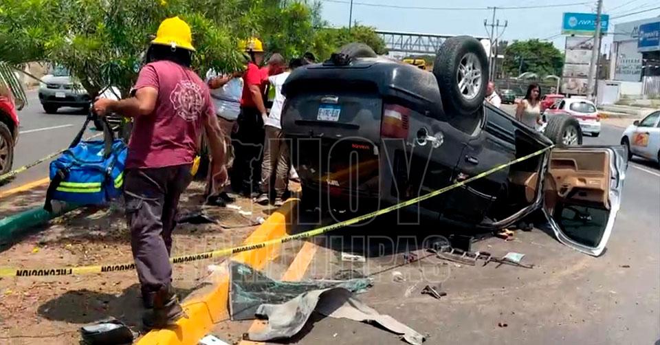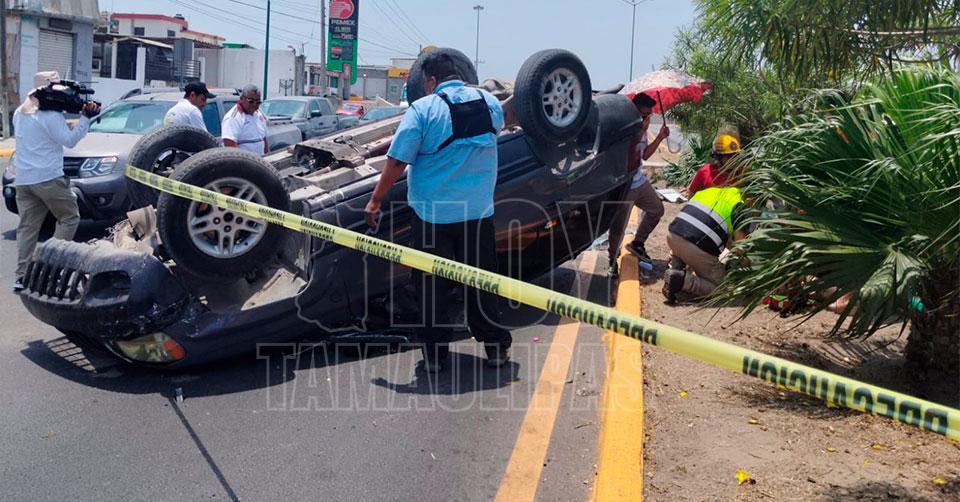 Altamira, Tamaulipas. - Con lesiones que no fueron de gravedad, resultó una mujer que viajaba como acompañante en una camioneta Jeep al volcar la unidad que previamente derribó a su paso un poste del servicio de alumbrado público en Altamira.