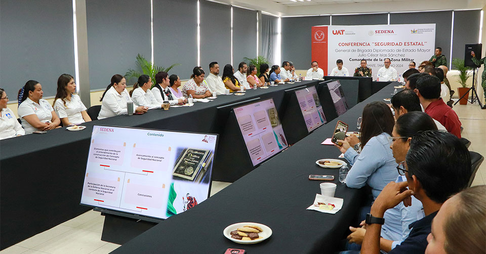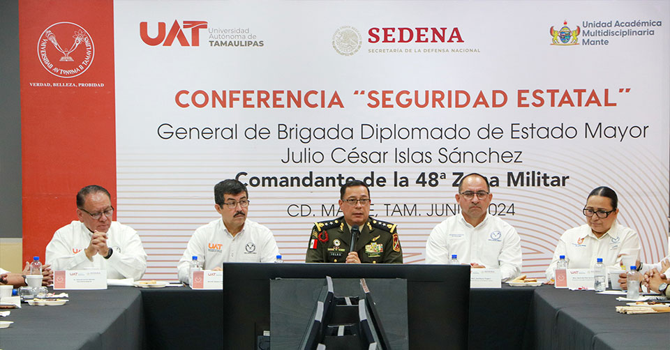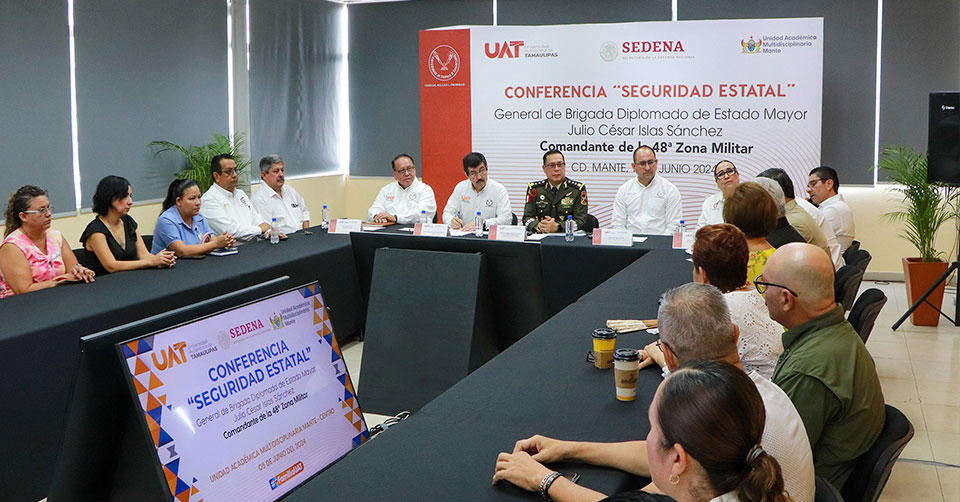 El Mante, Tamaulipas. - La Universidad Autónoma de Tamaulipas (UAT) organizó una conferencia sobre las funciones y el desempeño de la Secretaría de la Defensa Nacional (SEDENA), en el marco de la Reunión de Seguridad que se realizó en la Unidad Académica Multidisciplinaria Mante.