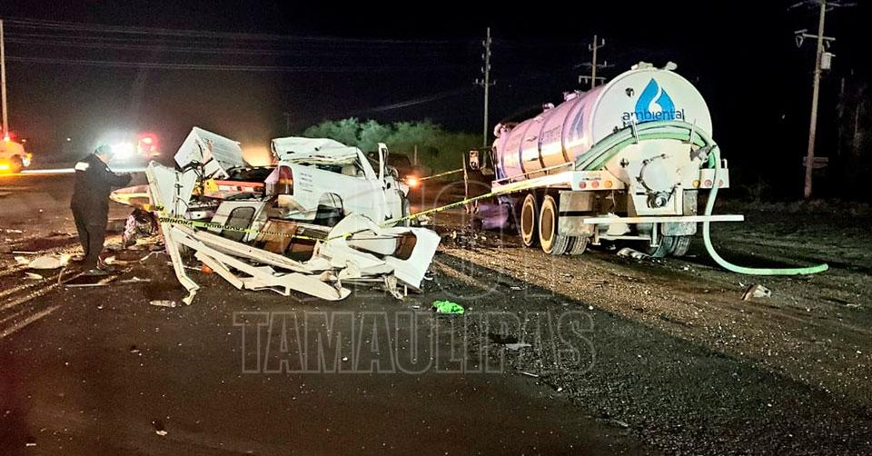Jiménez, Tamaulipas. - Una persona sin vida y al menos una más herida es el saldo preliminar de un choque entre una camioneta Pick-up y una pipa, en el kilómetro 95 de la carretera Victoria-Matamoros.