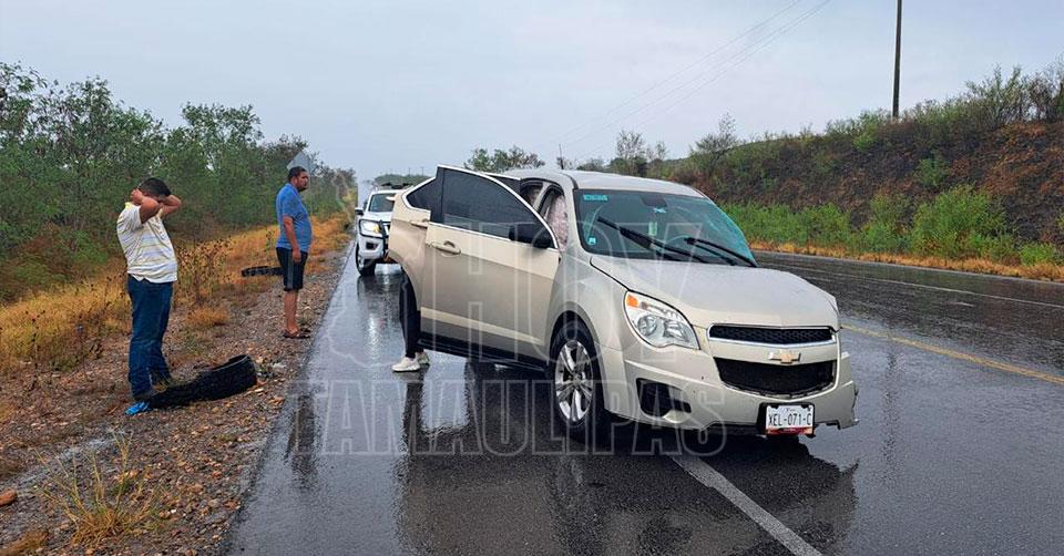 San Fernando, Tamaulipas. - La lluvia y la falta de precaución al conducir, fueron motivo para que una residente de Reynosa impactara su vehículo contra un tráiler que transitaba sobre el libramiento de San Fernando, dejando cuantiosos daños en las unidades y carga del tracto camión.