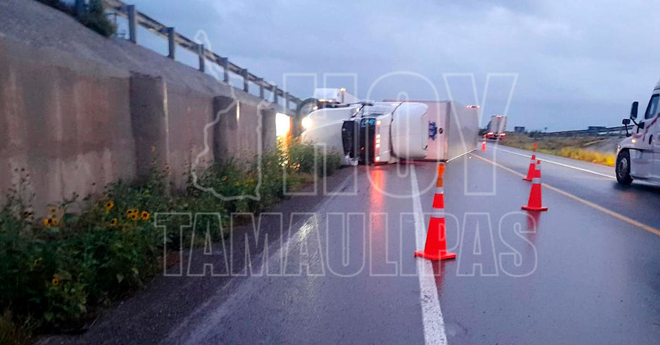 Trailero resultó lesionado tras volcadura en carretera a Nuevo Laredo