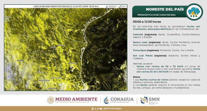 Adicionalmente, se espera viento con rachas de 50 a 70 kilómetros por hora (km/h) y oleaje de 1 a 3 metros (m) de altura en costas de Tamaulipas.