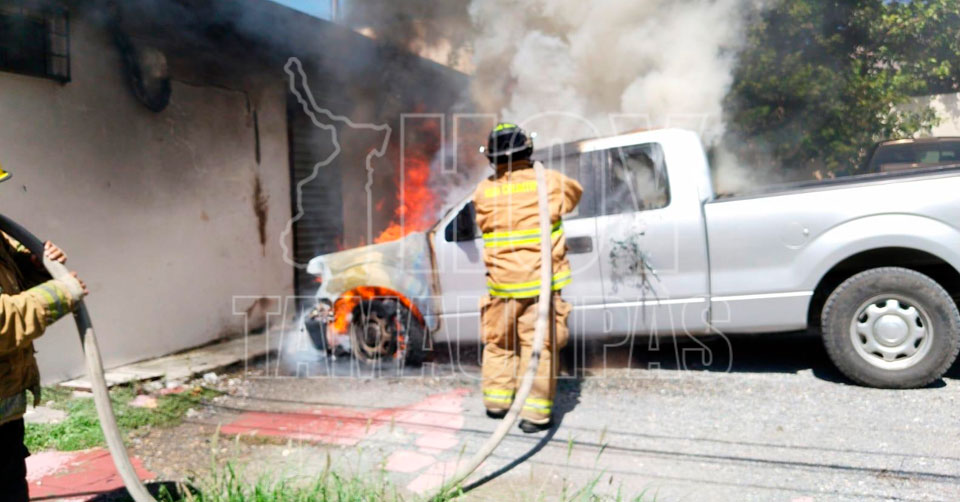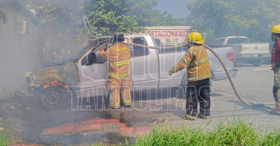 Ciudad Victoria, Tamaulipas. - Una camioneta Pick-up fue consumida por el fuego tras presentar un corto circuito en el sistema eléctrico esta mañana, en el estacionamiento del 10 Morelos.