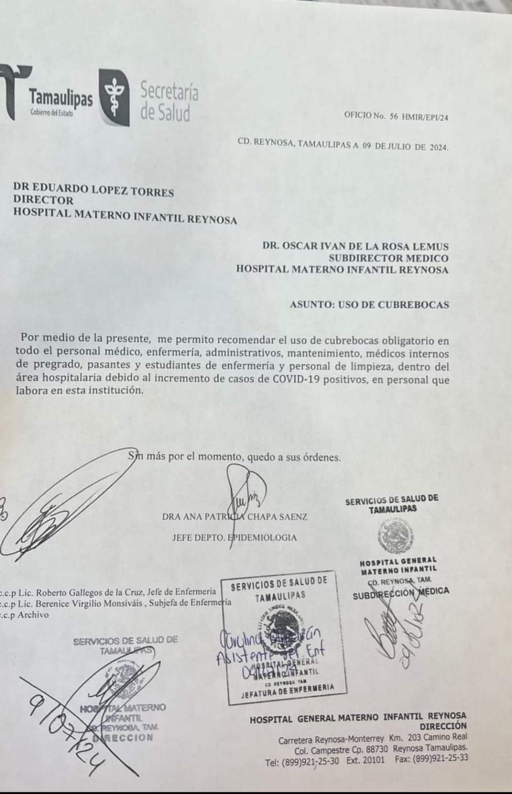 Fue la jefa del departamento de Epidemiología del propio hospital, Ana Patricia Chapa Sáenz, quién giró por escrito la instrucción para recomendar el uso de cubrebocas obligatorio en todo el personal médico, enfermería, administrativos, mantenimiento, médicos internos de pregrado, pasantes y estudiantes de enfermería, así como personal de limpieza dentro del área hospitalaria, debido al incremento de casos de Covid-19 positivos, en personal que labora en el nosocomio.