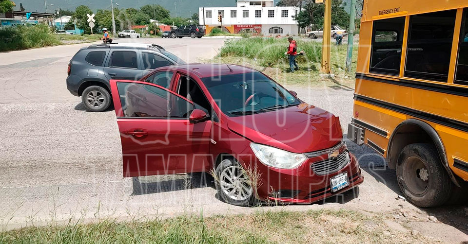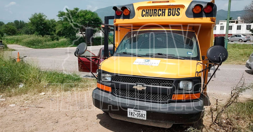 Ciudad Victoria, Tamaulipas. - Un microbús de la iglesia Dios Proveerá y un automóvil tipo Sedan chocaron esta mañana en el Eje Vial Lázaro Cárdenas y calle Alejandro Prieto, dejando como saldo solo cuantiosos daños materiales.
