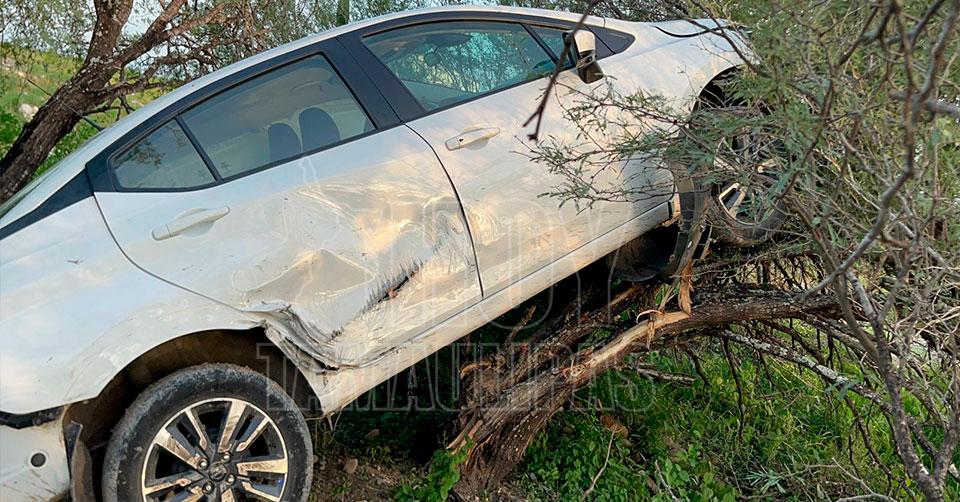 Ciudad Victoria, Tamaulipas. – Una mala maniobra al rebasar provocó que un conductor perdiera el control al volante de su vehículo y terminó encima de un mezquite en el kilómetro 21 de la carretera Zaragoza-Victoria.