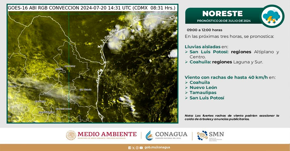 “En los estados de la vertiente del golfo de México se espera durante la tarde cielo nublado. El ambiente vespertino será cálido, y caluroso en zonas de Tamaulipas. Se pronostica viento del este y noreste de 10 a 25 km/h en la región, con rachas de 40 a 60 km/h en Tabasco y rachas de 30 a 50 km/h en Veracruz, así como posibles tolvaneras en Tamaulipas”.