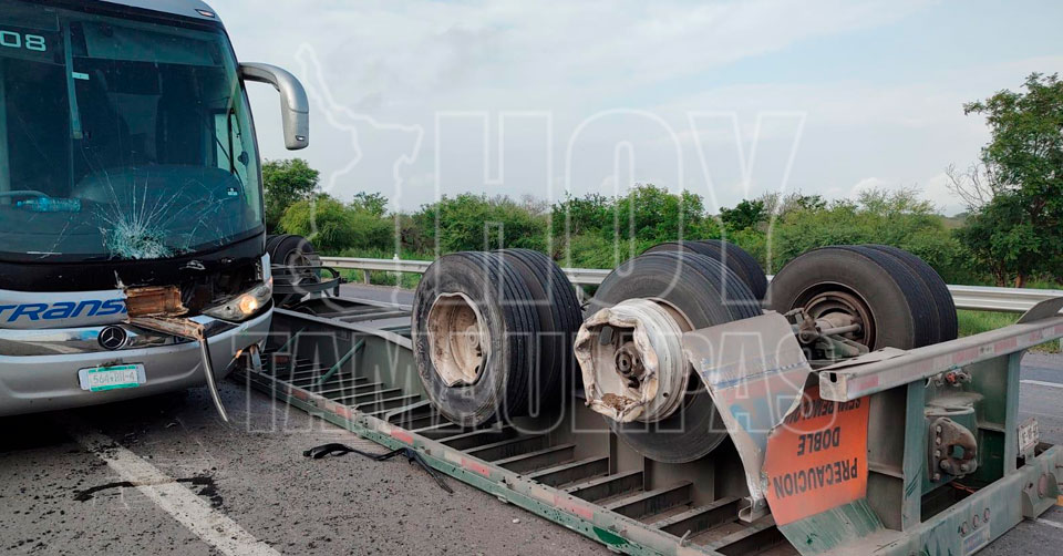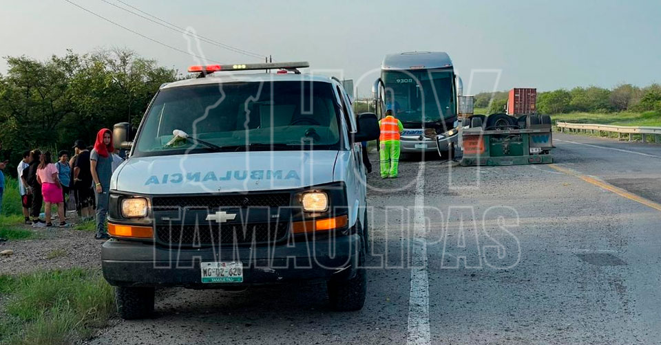 Ciudad Victoria, Tamaulipas. - Cerca de 12 pasajeros de un autobús de la línea Transpaís fueron atendidos por socorristas de Protección Civil de Llera esta mañana, luego de que un portacontenedor se estrelló contra la unidad 9308.