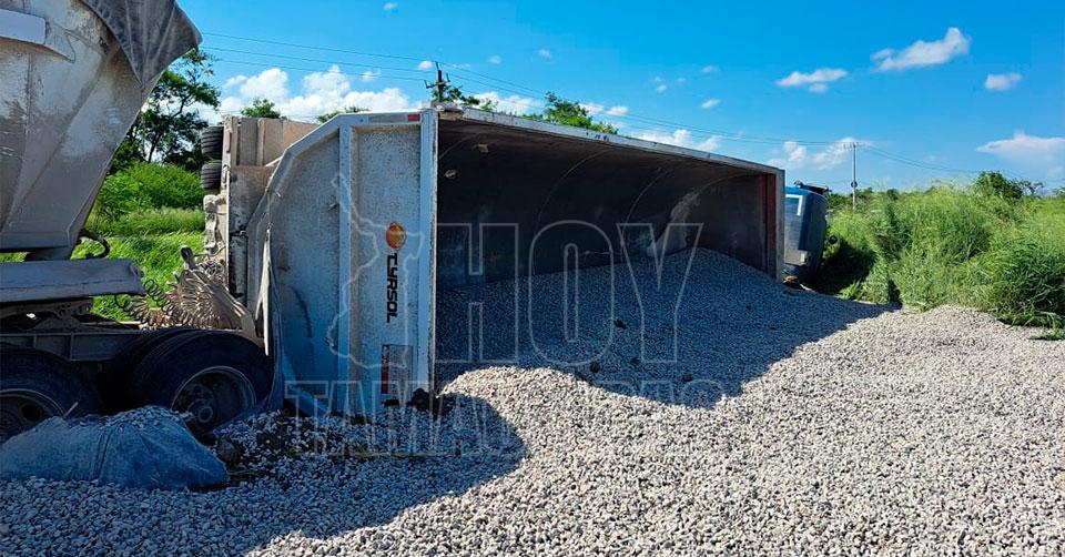 San Fernando, Tamaulipas. - El exceso de velocidad propició que una unidad de doble remolque dedicado al transporte de materiales que transportaba arena se volcara en el kilómetro 192 de la carretera Victoria-Matamoros, antes de llegar al entronque del Ejido Francisco Villa en San Fernando.