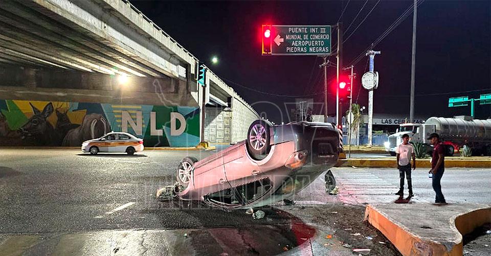 Nuevo Laredo, Tamaulipas. — Un conductor resultó ileso de manera milagrosa luego de que su automóvil volcó tras chocar contra un tráiler en el entronque de la Carretera Aeropuerto y la Carretera Nacional, a un costado del puente "Corona", al sur de Nuevo Laredo