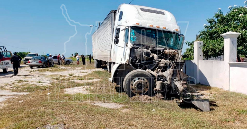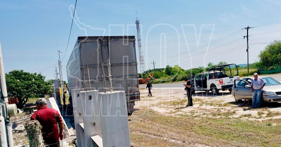 Jiménez, Tamaulipas. - Un tráiler se salió de la cinta asfáltica en el kilómetro 119 de la carretera Victoria-Matamoros, a la altura de la comunidad El Encinal, impactándose contra la barda de una vivienda y causando daños materiales.