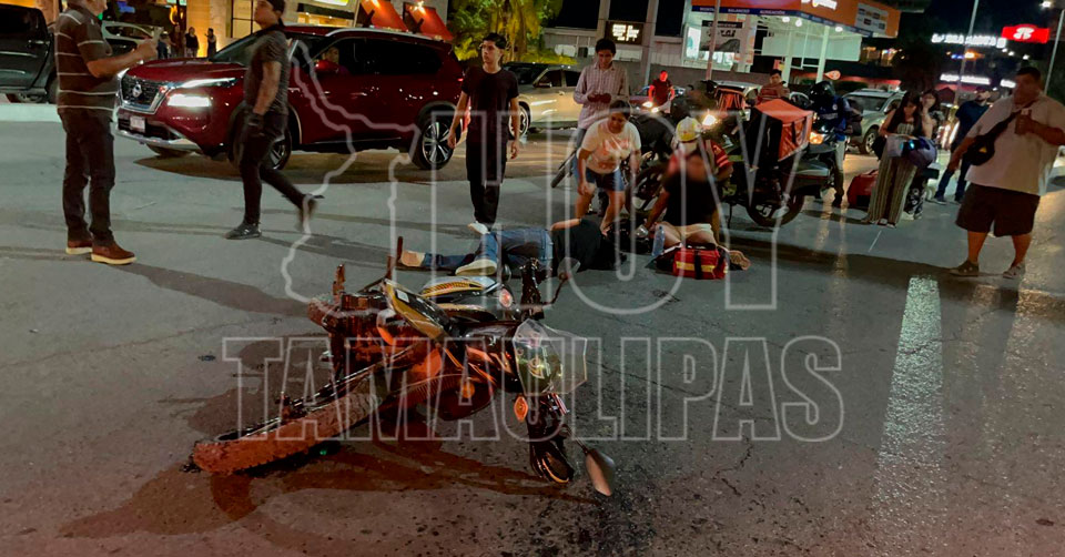 Ciudad Victoria, Tamaulipas. – Una pareja de repartidores que viajaba a bordo de una motocicleta resultó lesionada anoche en el Boulevard Tamaulipas y calle Michoacán en Ciudad Victoria, luego de que fueron embestidos por una camioneta cuyo conductor se dio a la fuga.