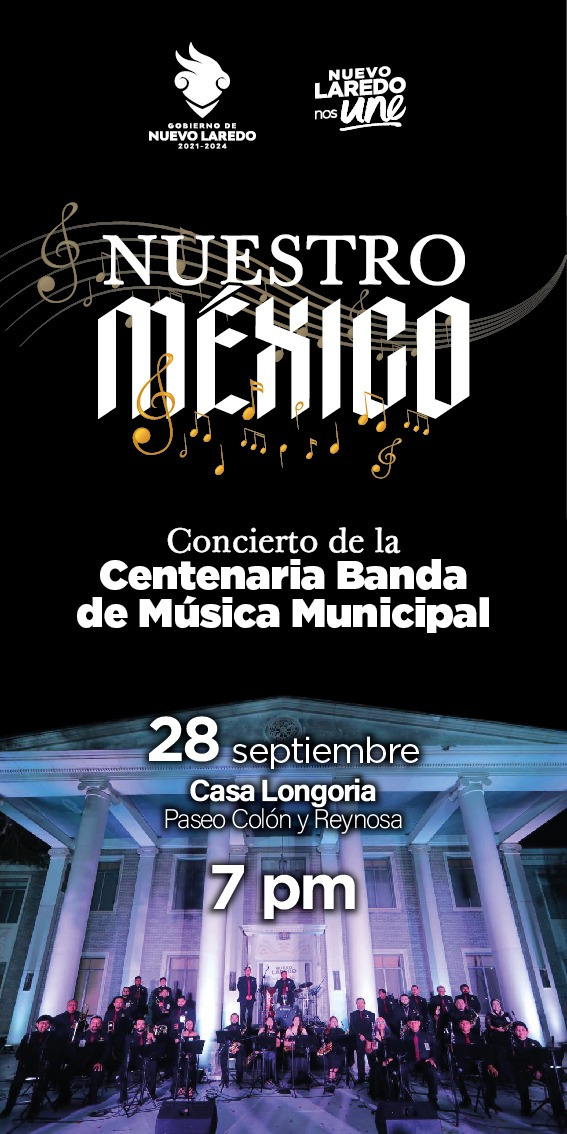 Nuevo Laredo, Tamaulipas.-Todo se encuentra listo para el gran concierto “Nuestro México” que ofrecerá la Centenaria Banda Municipal de Música que se llevará a cabo este 28 de septiembre a las 7:00 PM en la emblemática Casa Longoria ubicada entre Paseo Colón y Reynosa.