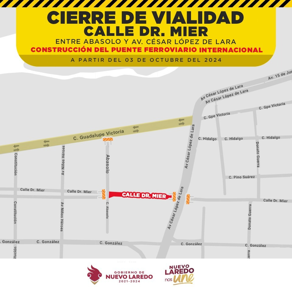 Nuevo Laredo, Tamaulipas.-Por cuestiones de seguridad para automovilistas y peatones, y debido a los trabajos que se llevan a cabo para la construcción del segundo puente del ferrocarril, serán cerradas varias vialidades en esa área.
