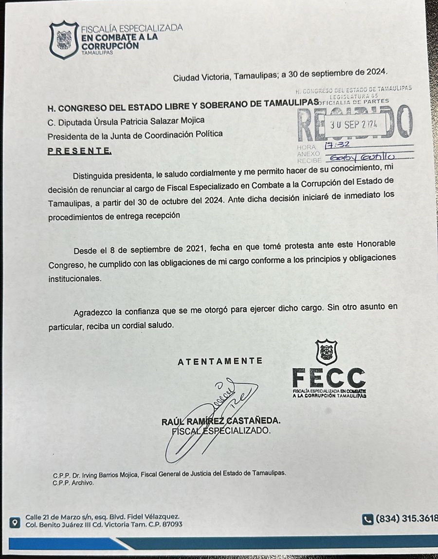 Ciudad Victoria, Tamaulipas. – El fiscal Anticorrupción en Tamaulipas Raúl Ramírez Castañeda presentó su renuncia al cargo este día, misma que se hará efectiva a partir del 30 de octubre, de acuerdo a una carta enviada a la presidenta de la Junta de Gobierno en el Congreso del Estado, Úrsula Salazar Mojica.